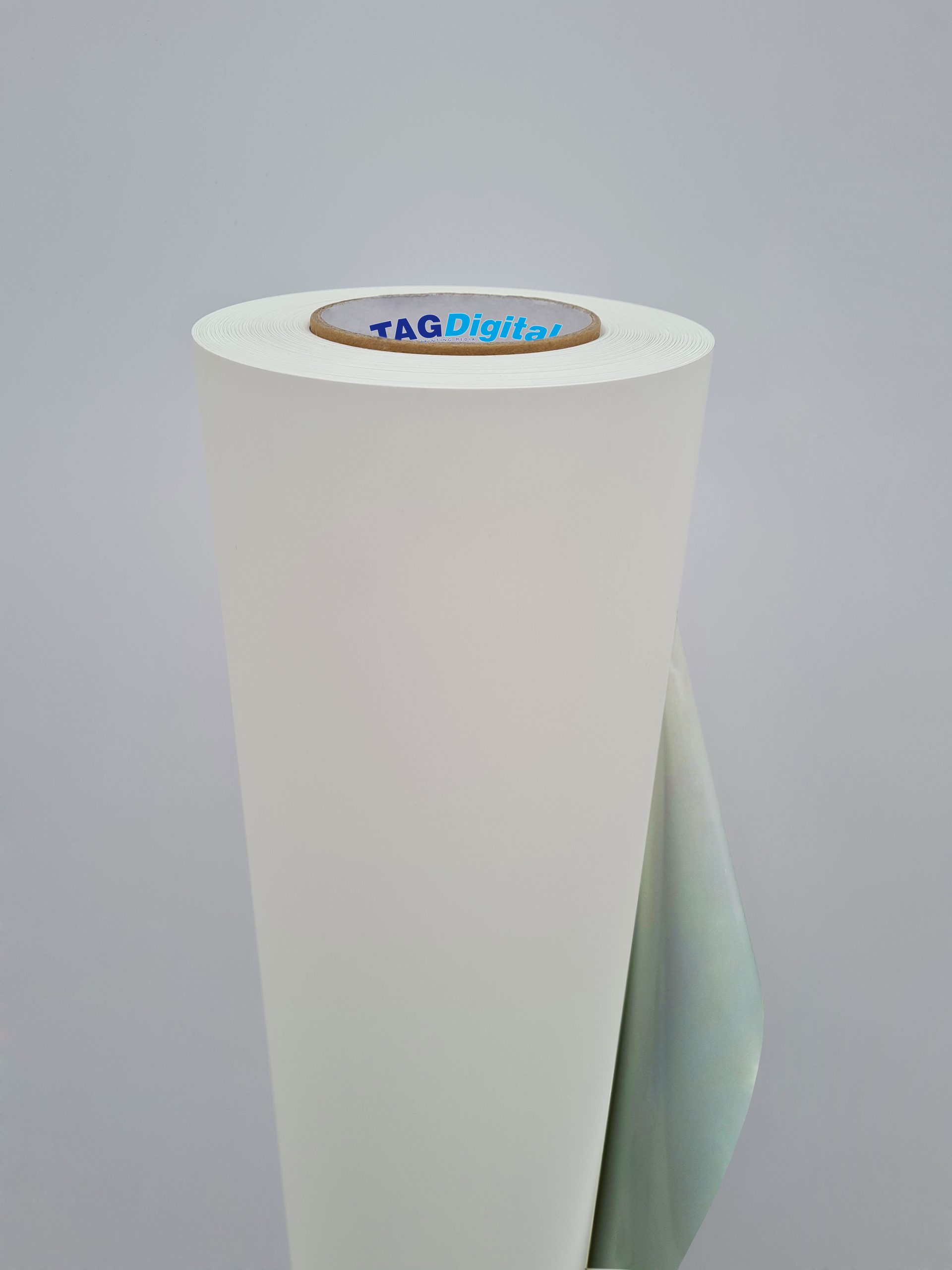 is specially designed for roll-ups. The product consists of a white PET film with a matte coating on the front for excellent color rendition. The reverse side is silver, giving it 100% opacity. PET makes the product highly stable, superflat and anti-curling.
